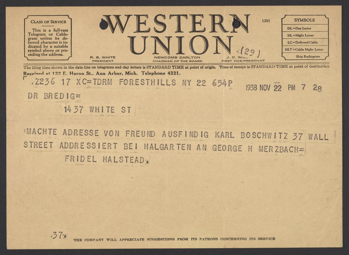 Halstead, Fridel G. “Telegram from Fridel Halstead Addressed to Georg Bredig, November 22, 1939,” November 22, 1939. Papers of Georg and Max Bredig, Box 1, Folder 23. Science History Institute. Philadelphia. https://digital.sciencehistory.org/works/zntzpt9.