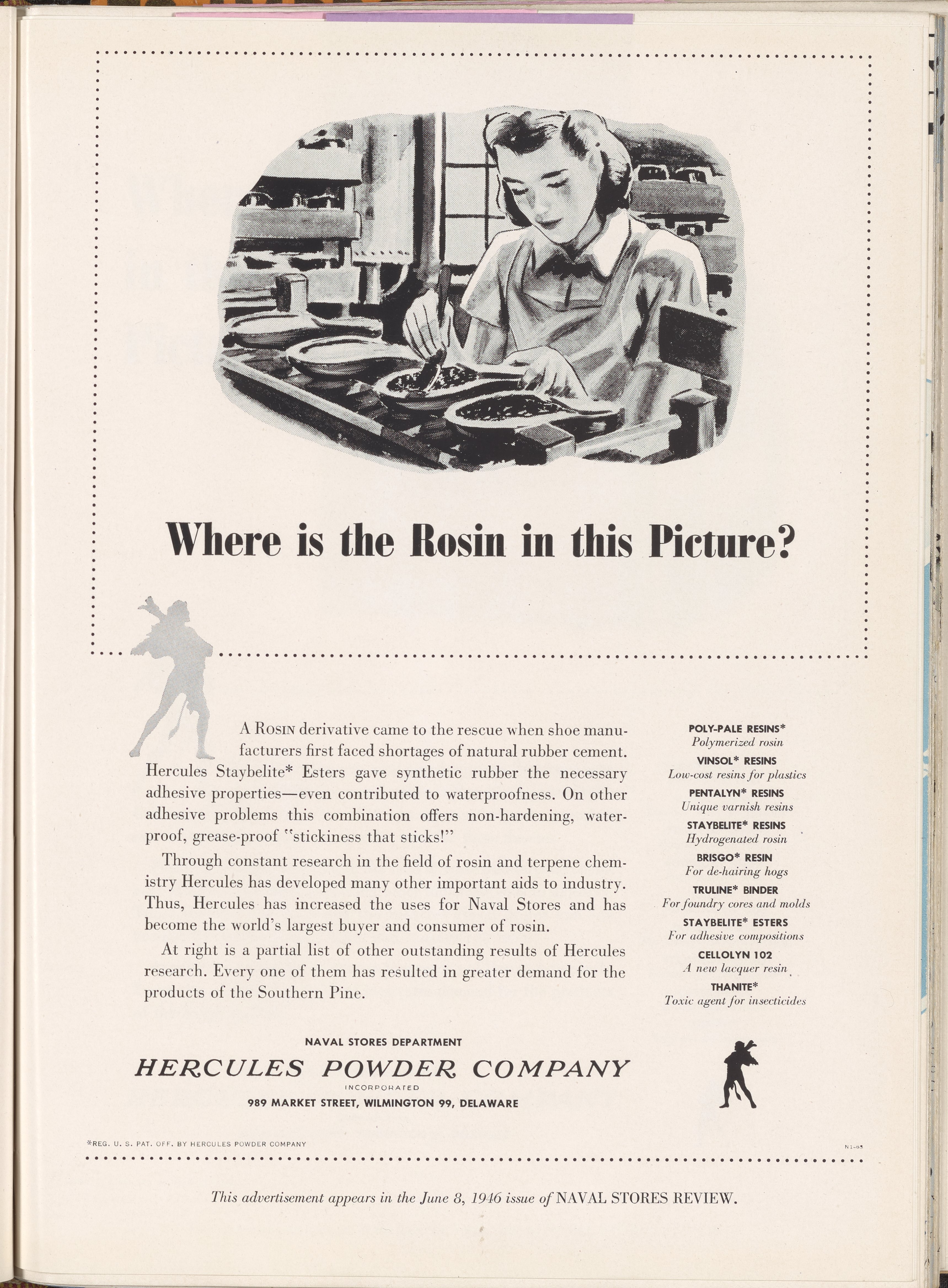 Hercules Incorporated. “Where Is the Rosin in This Picture?” 1946 Hercules Advertisements, 1946. Records of Hercules Incorporated, Volume 1946. Science History Institute. Philadelphia. https://digital.sciencehistory.org/works/zo7tu2x.