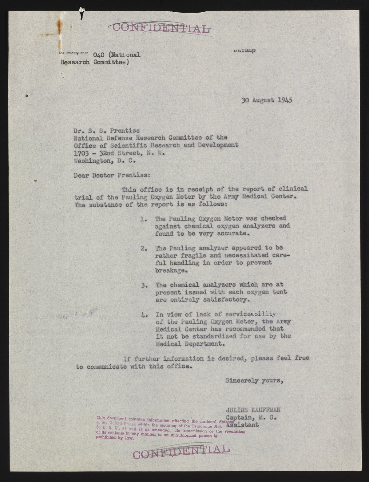 Summarizing a report of the Army Medical Center's trial of the Pauling oxygen meter, Julius Kauffman noted that the device was accurate but "rather fragile."