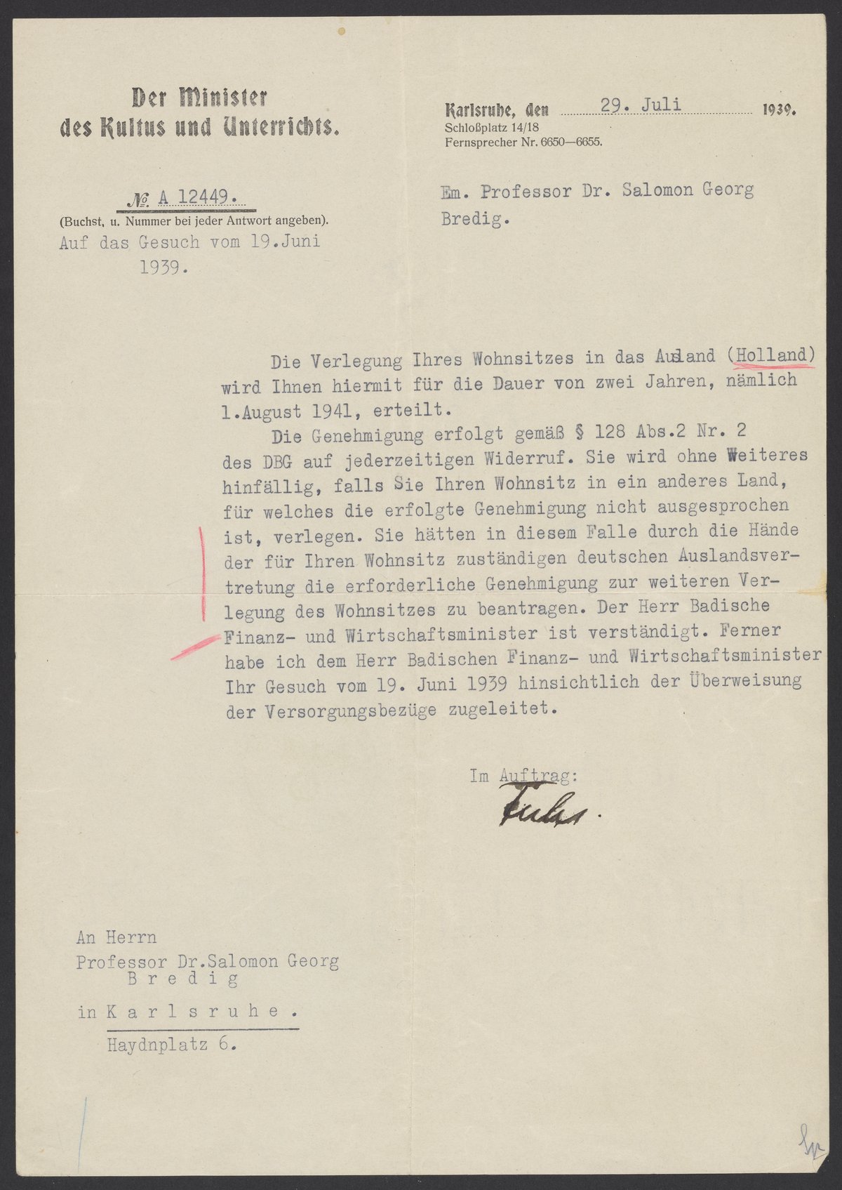 Die Genehmigung erfolgt gemäß 128 Abs. 2 Nr. 2 DBG auf jederzeitigen Widerruf. Sie wird ohne Weiteres hinfällig, falls Die Ihren Wohnsitz in ein anderes Land, für welches die erfolge Genehmigung nicht ausgesprochen ist, verlegen. Sie hätten in diesem Falle durch die Hände der für Ihren Wohnsitz zuständigen deutschen Auslandsvertretung die erforderliche Genehmigung zur weiteren Verlegung des Wohnsitzes zu beantragen. Der Herr Badische Finanz-und Wirtschaftsminister ist verständigt. Ferner habe ich dem Herr Badischen Finanz-und Wirtschaftsminister Ihr Gesuch vom 19. Juni 1939 hinsichtlich der Überweisung der Versorgungsbezüge zugeleitet.