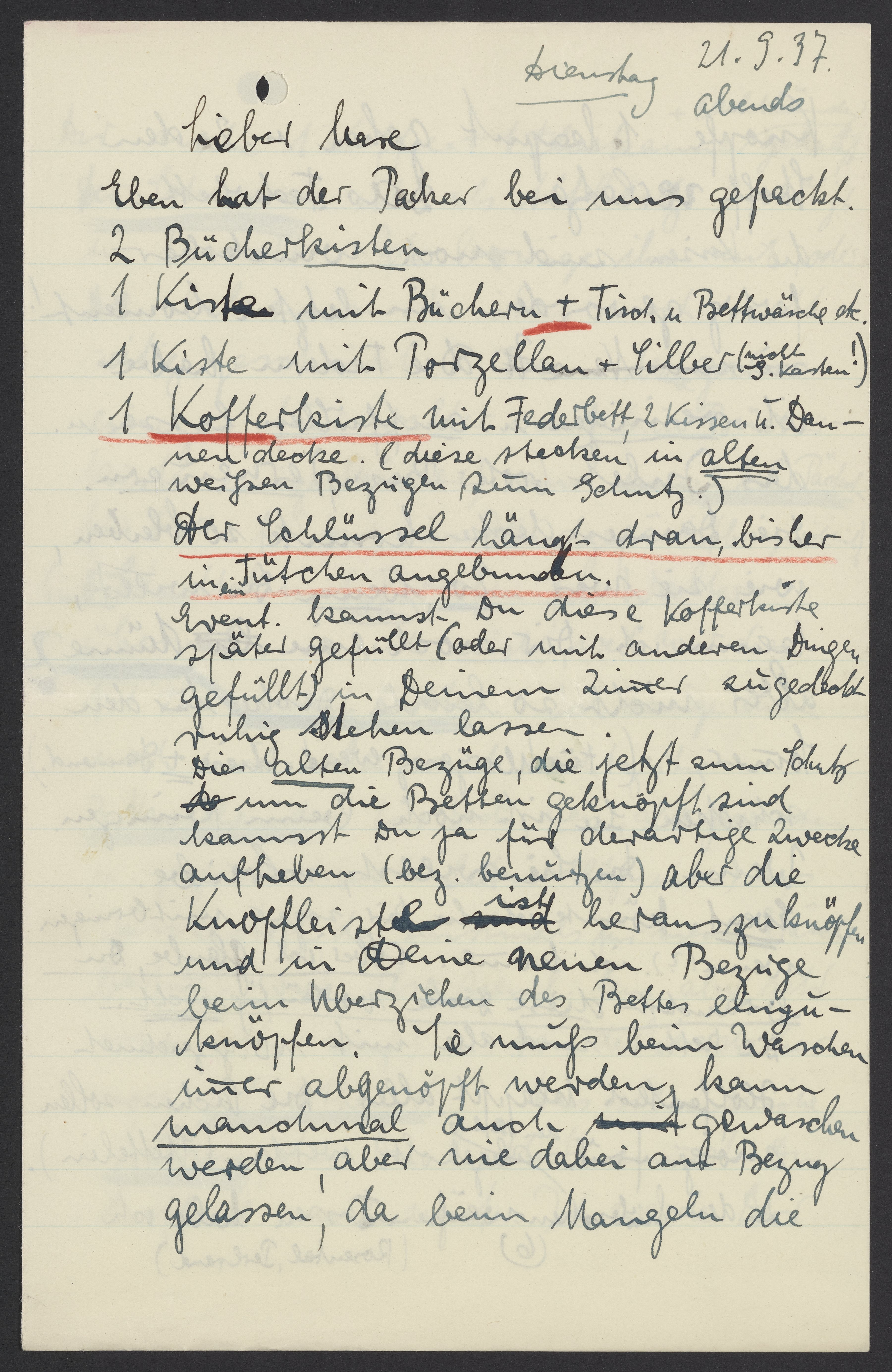 Dir noch 1 Kaffee + 1 Thekanne + 1 Milchkännchen gekauft. Der Schmuck ist als Altbesitz bestätigt u. erreicht. Ich bringe ihn mit, oder Du bekommst ihn noch rechtzeitig geschickt. Frau Marx gab einiges für Walter mit (= in Bücherkiste einige Bücher) und 2 mal Packet für Lore u. für Dich ins Handgepäck (bringe ich mit) . Eine Schachtel mit Briefen für Walter übernahm ich nicht, weil wir dies für zu gewagt halten. Ich bringe auch noch mit oder send rechtzeitig 3 Nachthemden für Dich, neu, aber gewaschen, u. gezeichnet (an den Seitenschlitzen unten) aus Wäschestoff, der einstmals für meine Wäsche bestimmt war, also ziemlich fein aber sehr schon ist (weiß) u. von der Wäsche her noch 1 Sporthemd. Das schreckliche Nähzeug, das Du hattest, nimmst Du hoffentlich nicht mit. Ich werde Dir