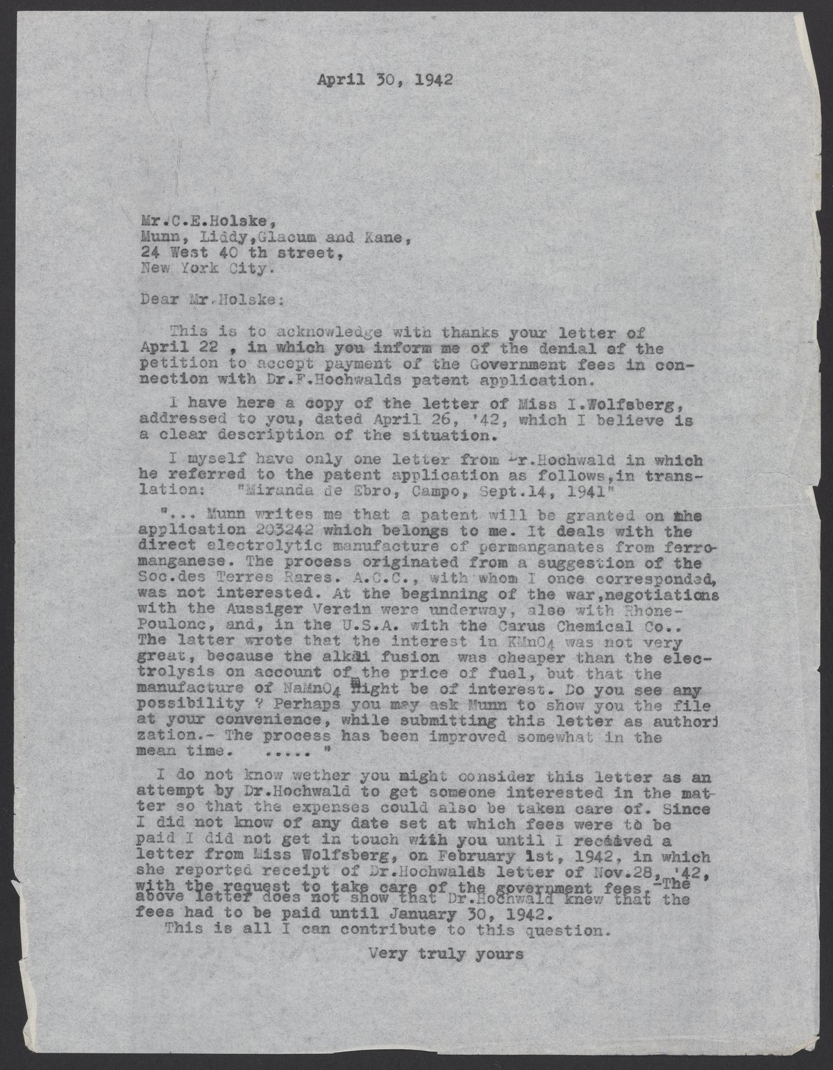 Letter from Max Bredig to Clarence. E. Holske, April 30, 1942