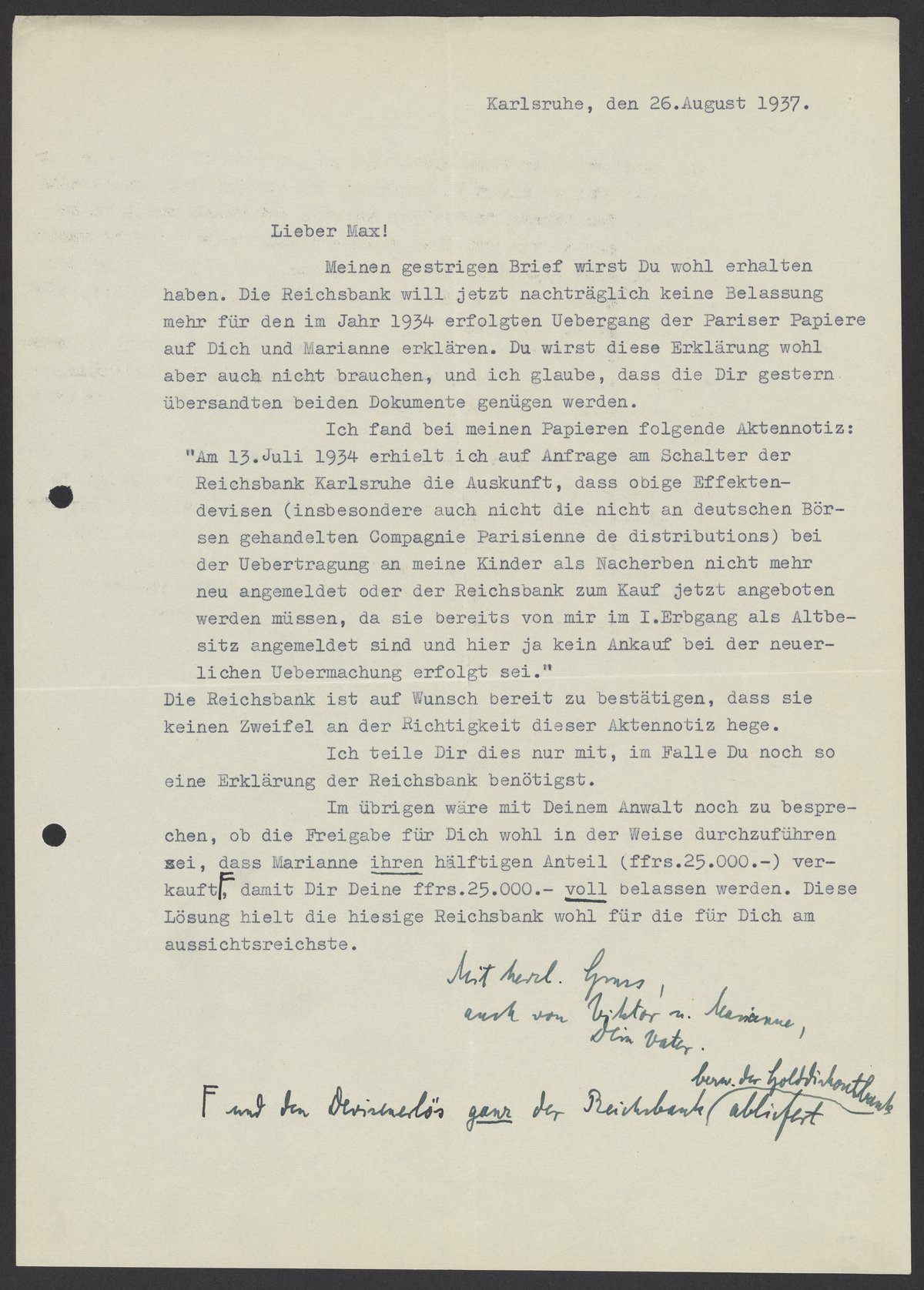 Meinen gestrigen Brief wirst Du wohl erhalten haben. Die Reichsbank will jetzt nachträglich keine Belassung mehr für den im Jahr 1934 erfolgten Uebergang der Pariser Papiere auf Dich und Marianne erklären. Du wirst diese Erklärung wohl aber auch nicht brauchen, und ich glaube, dass die Dir gestern übersandten beide Dokumenten genügen werden.