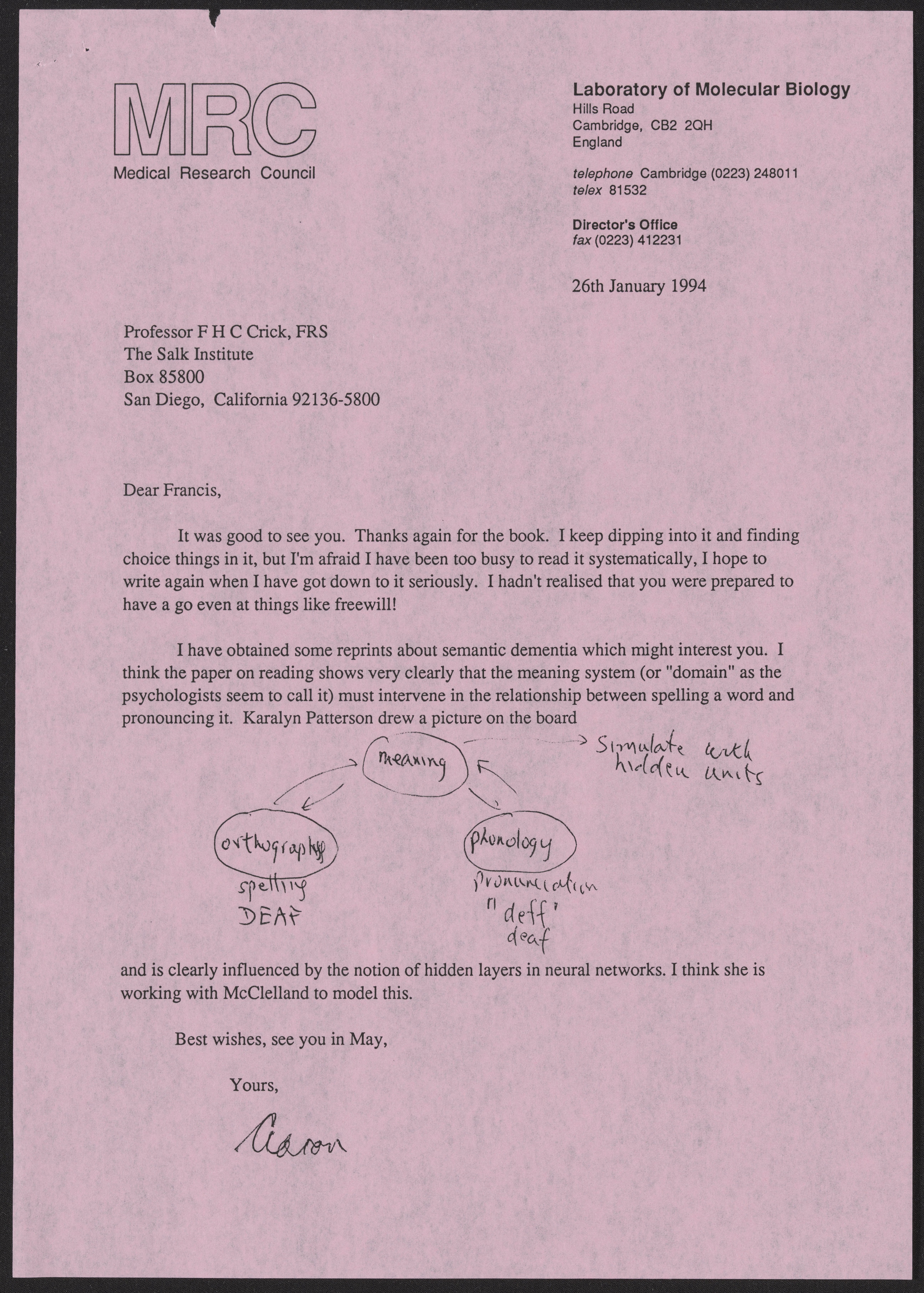 Letter from Aaron Klug to Francis Crick, January 16, 1994