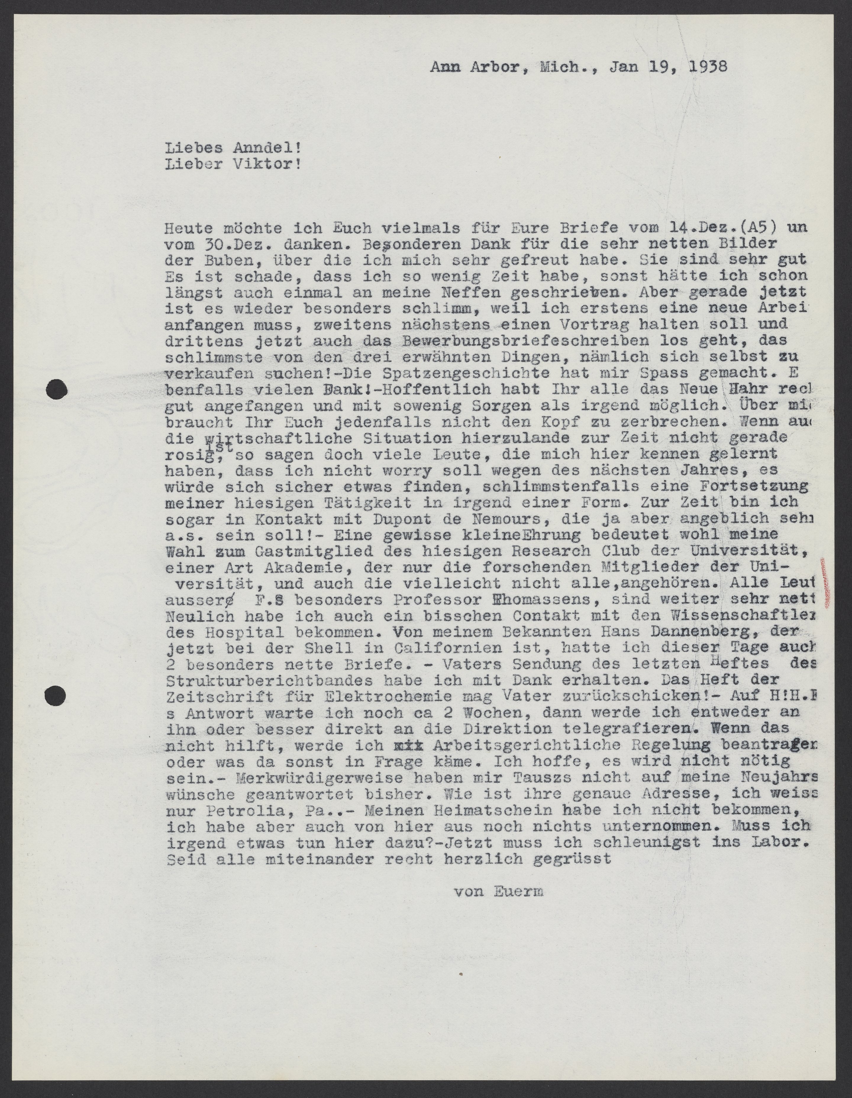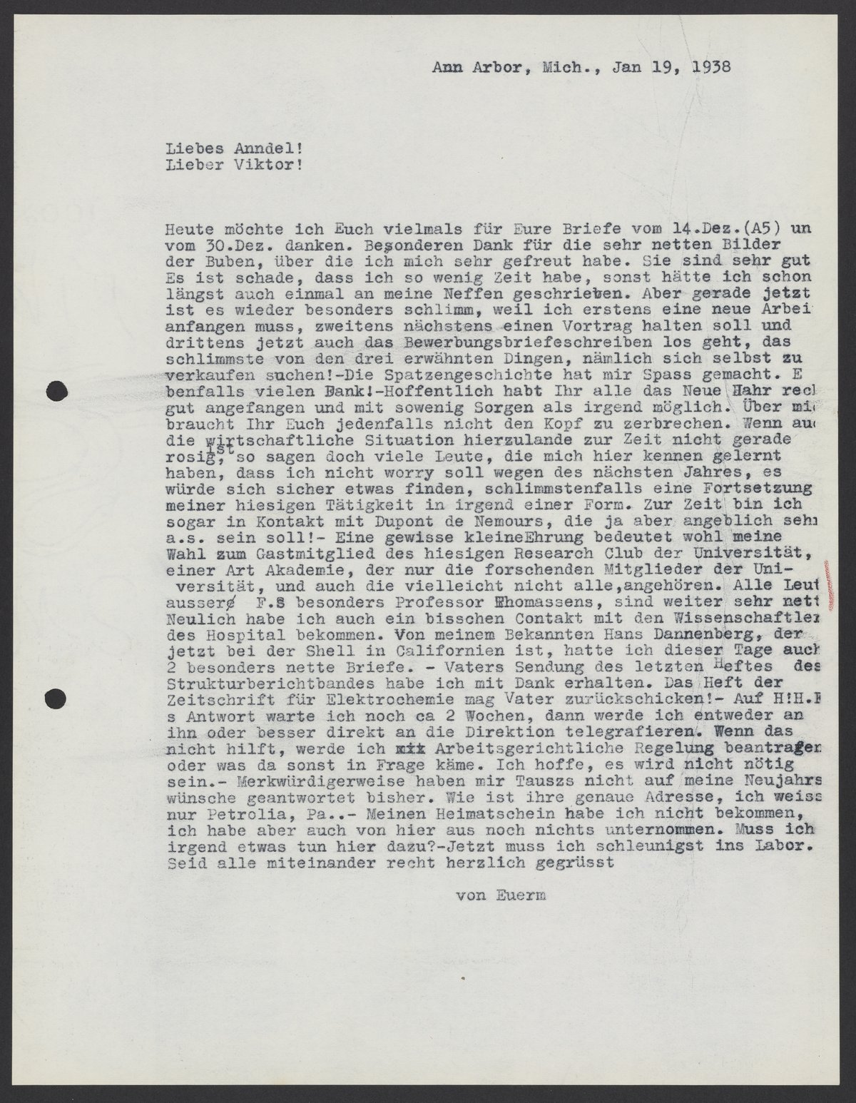 Letter from Max Bredig to Marianne and Viktor Homburger, January 19, 1938