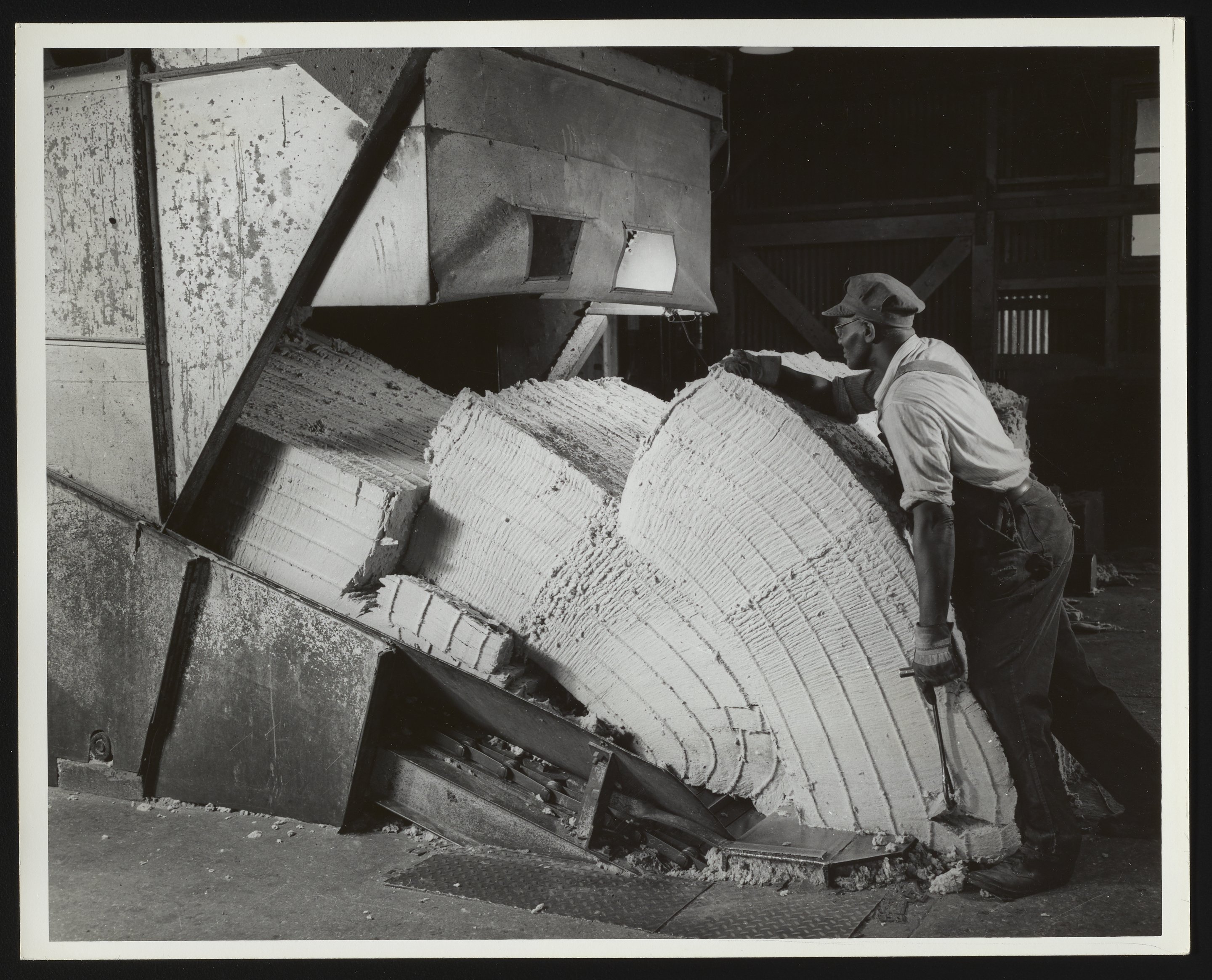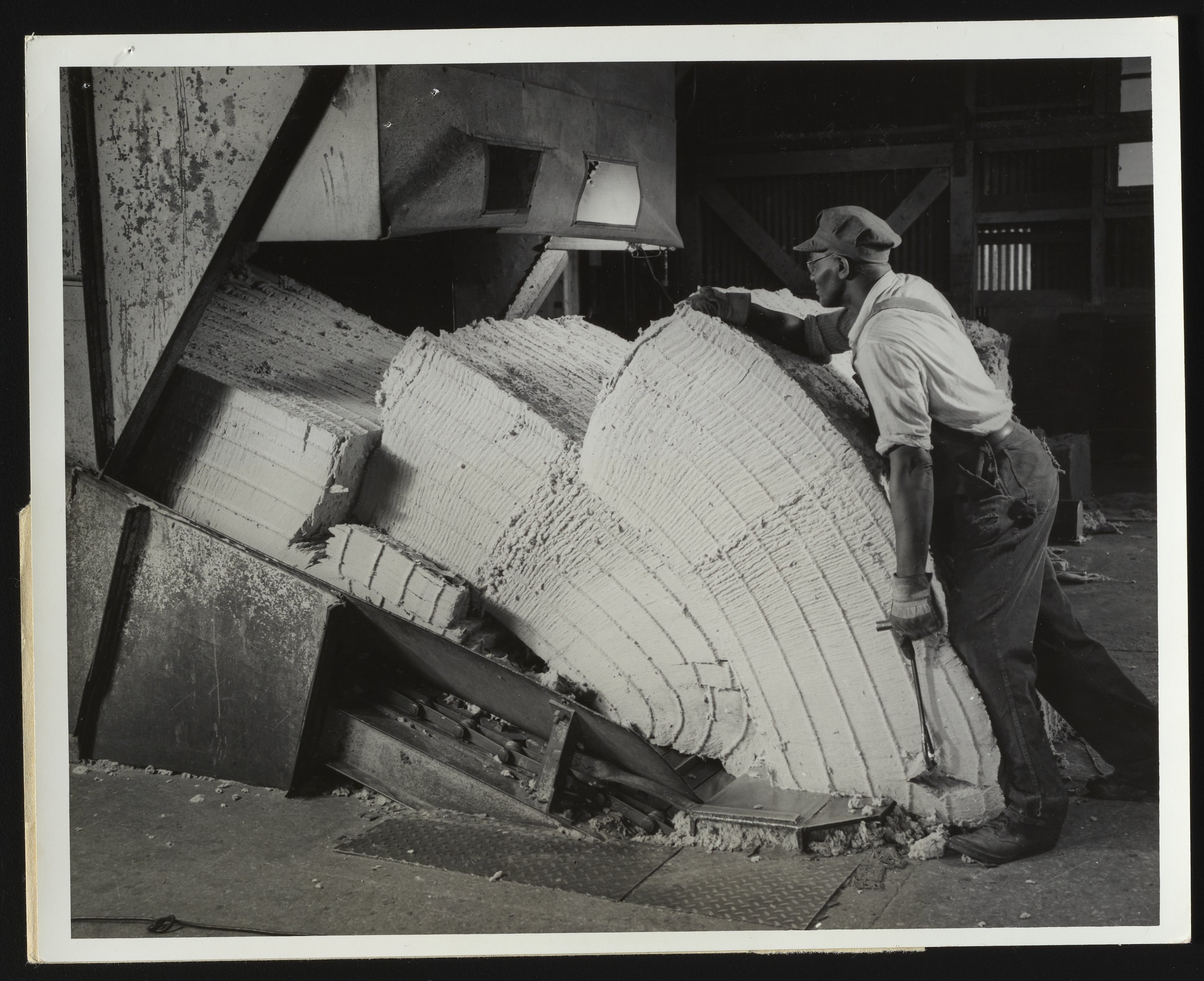 Hercules Incorporated. “Paul F. Brown Operating Bale Breaking Machine at Hercules Hopewell Plant,” 1951. Photographs from the Records & Ephemera of Hercules Incorporated, Box 1, Folder 36. Science History Institute. Philadelphia. https://digital.sciencehistory.org/works/zw12z596t.
