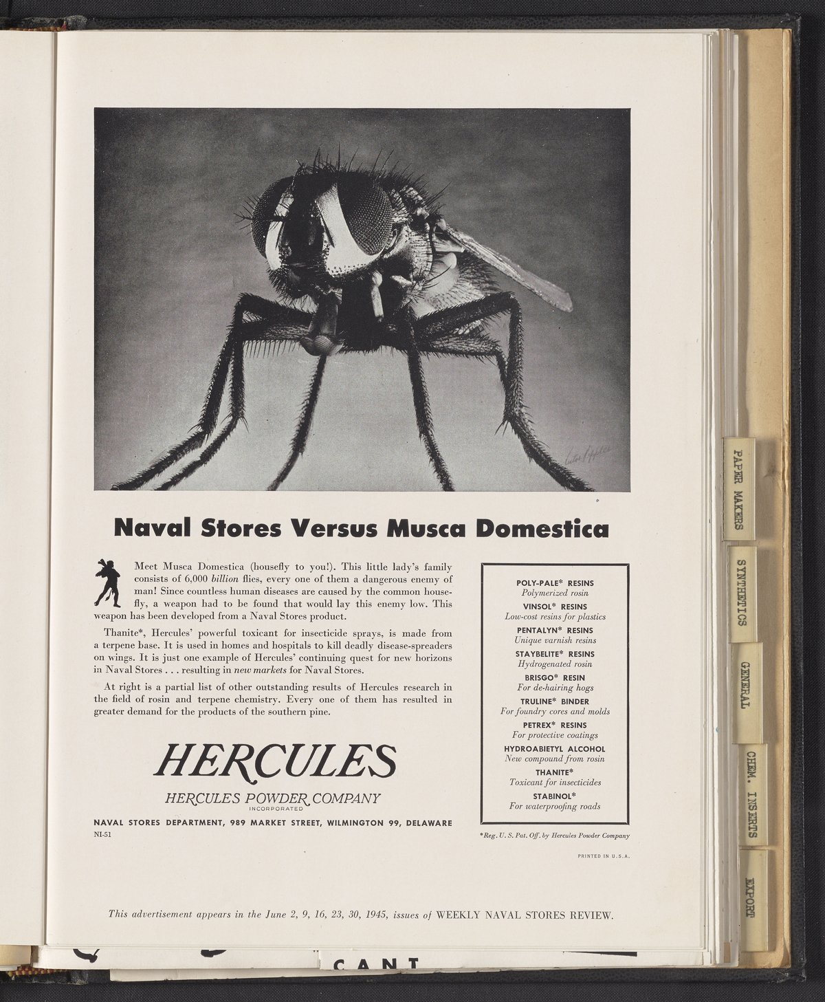Hercules Incorporated. “Naval Stores Versus Musca Domestica.” 1945 Hercules Advertisements, 1945. Records of Hercules Incorporated, Volume 1945. Science History Institute. Philadelphia. https://digital.sciencehistory.org/works/zw12z5973.