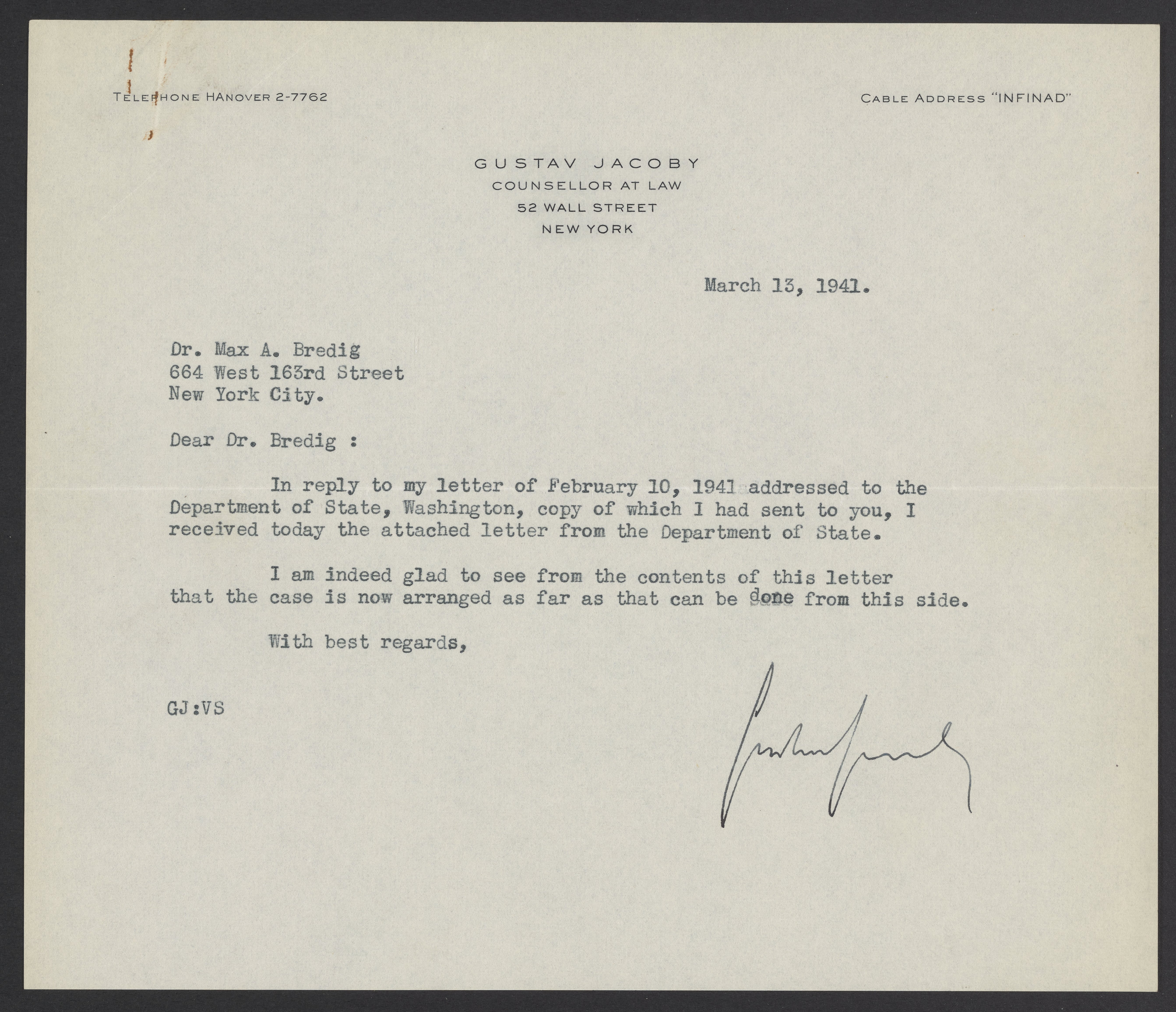 Letter from Gustav Jacoby to Max Bredig, March 13, 1941