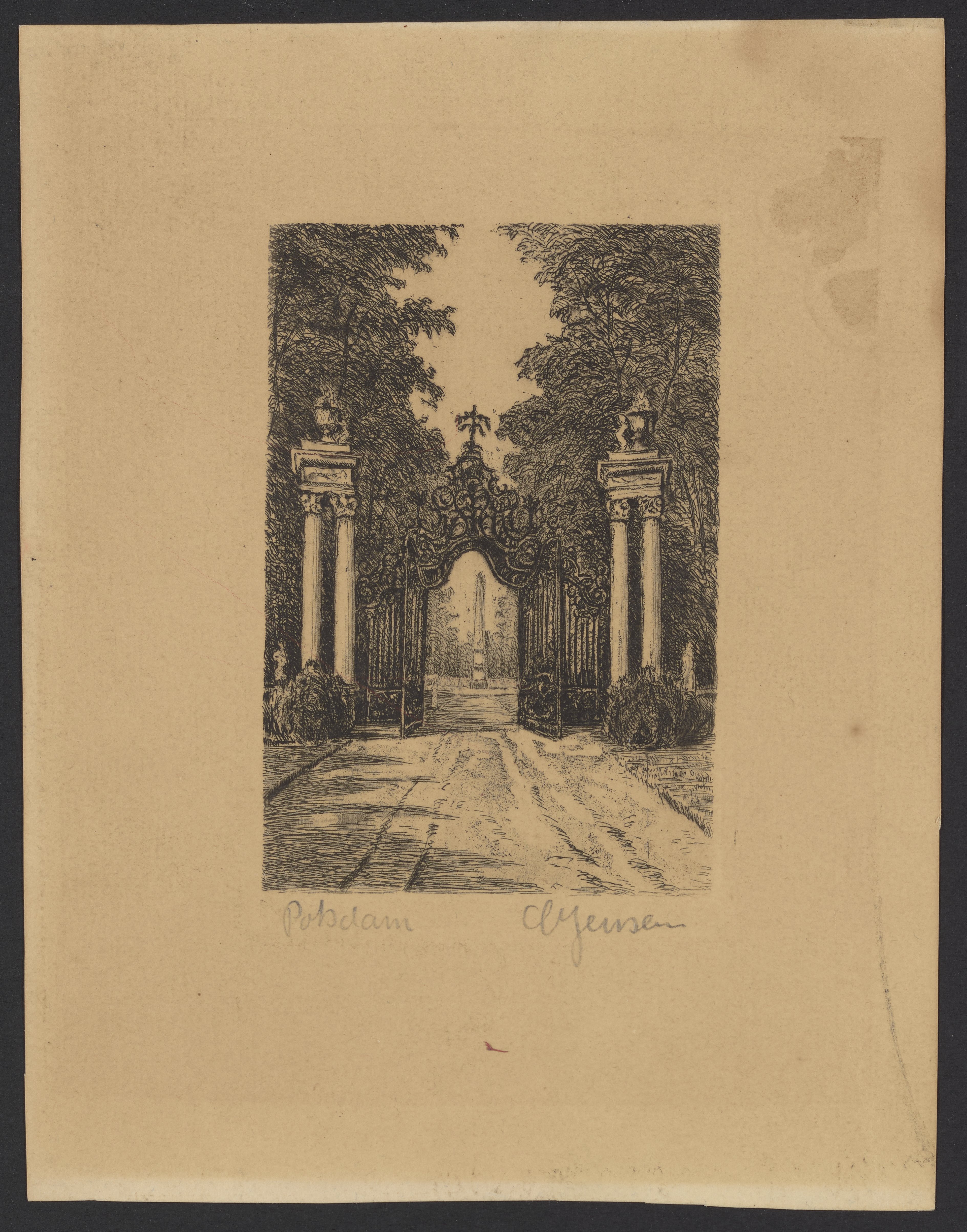 Small JPG1200 x 1529px — 318 KBLarge JPG2880 x 3669px — 1.6 MBFull-sized JPG3777 x 4812px — 2.5 MBOriginal fileTIFF — 3777 x 4812px — 52.1 MBIllustration by C. Jensen of a gate located in Sanssouci park, Potsdam Germany. Illustration was gifted from Mariele Krieger to Georg Bredig (1868-1944).