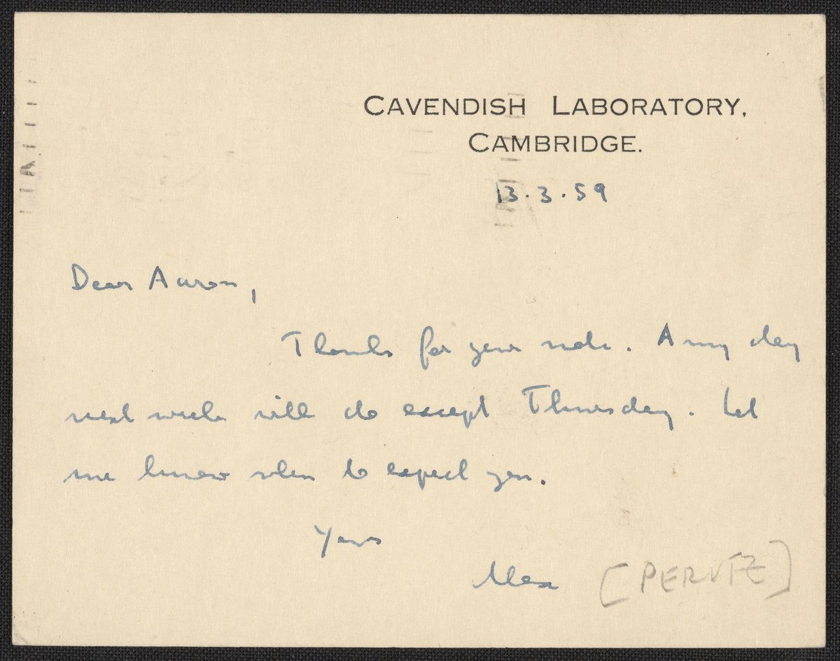 Small JPG1200 x 944px — 153 KBFull-sized JPG2835 x 2230px — 871 KBOriginal fileTIFF — 2835 x 2230px — 18.1 MBLetter from Max Perutz (1914-2002) to Aaron Klug (1926-2018), written March 13, 1958.